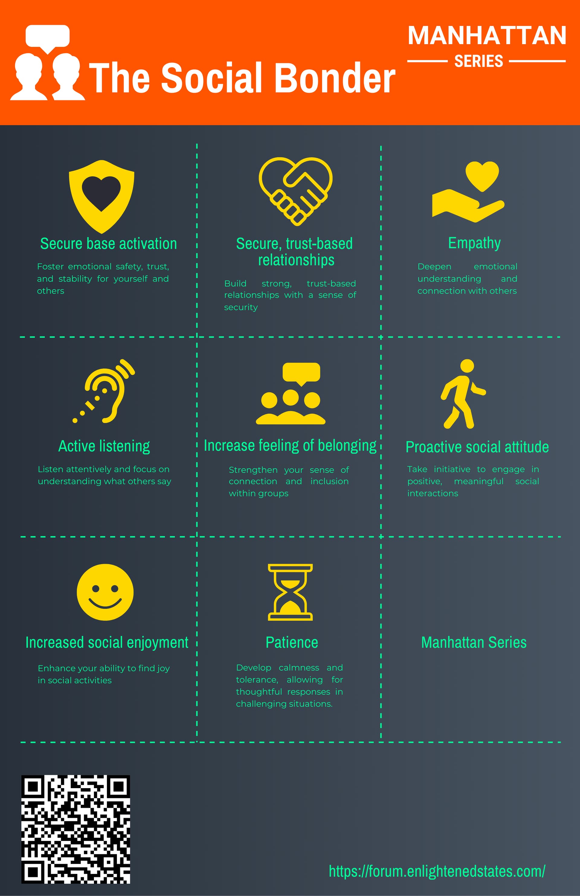 Based on Attachment theory this wiring field will retroactively procure a secure base for yourself and others, fostering a sense of safety, trust and emotional stability. It will grow your empathetic skills, make you a better active listener, facilitate bonding and feelings of belonging, social enjoyment whilst giving you a patient and socially proactive mindset.